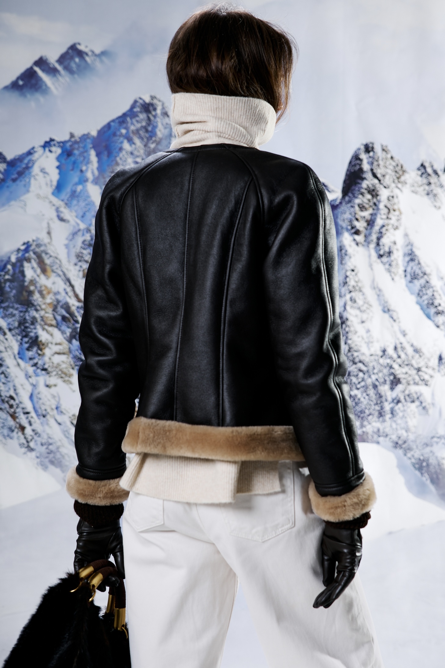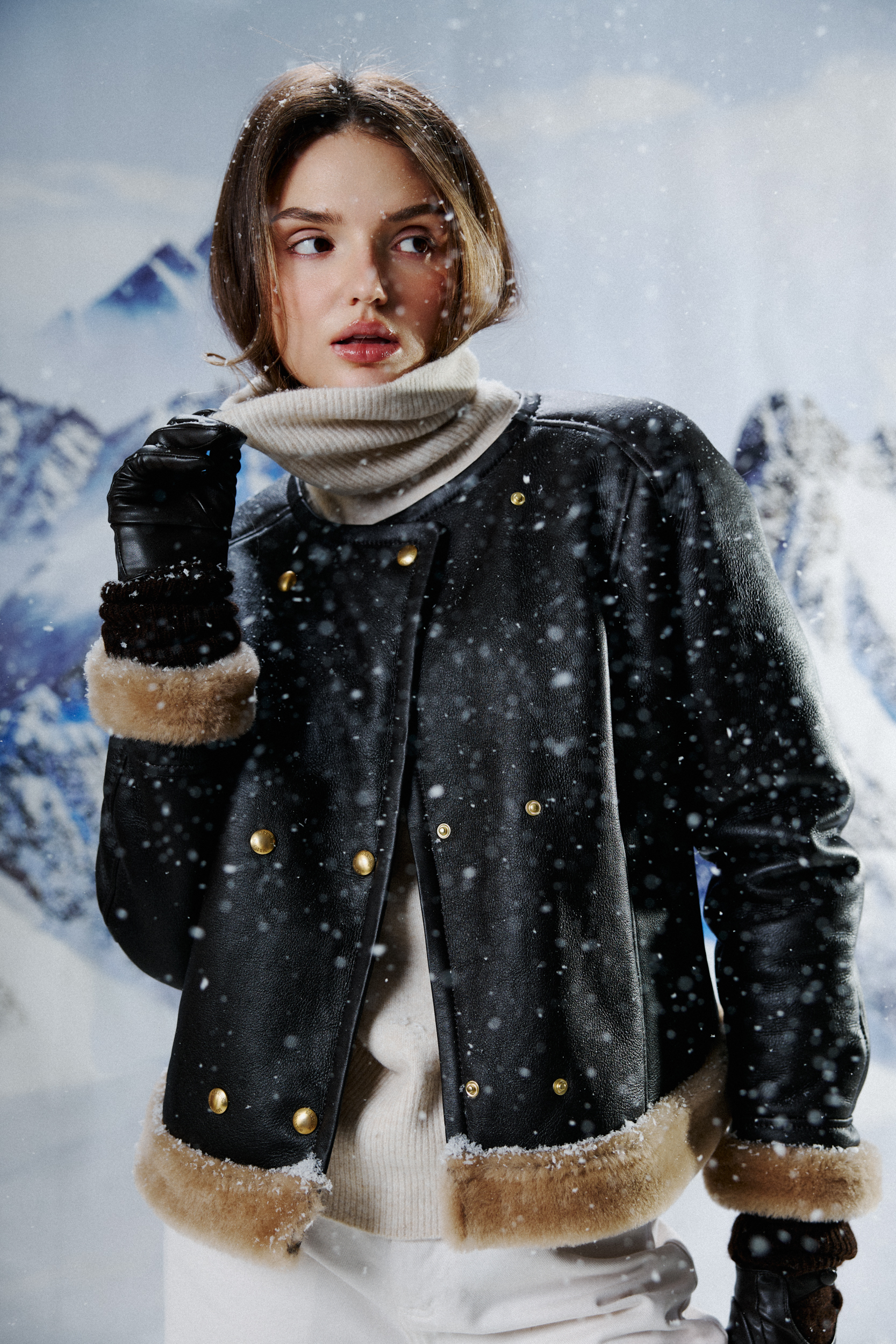 Kożuch naturalny w ciemnym odcieniu brązu z jaśniejszym włosem. Profilowane ramiona i zaznaczona talia. Zapinany na złote napy z logo marki.